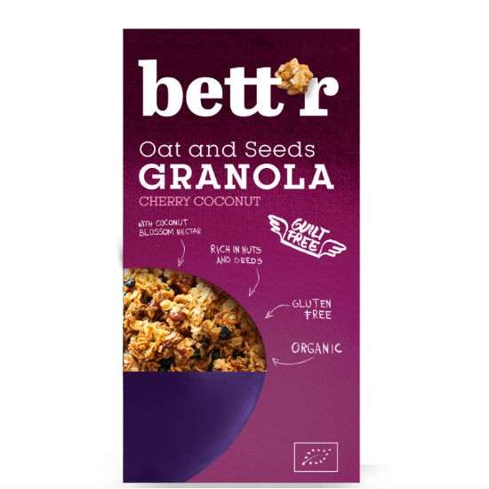 Ήρθε η ώρα για μια θρεπτική, πλούσια και απολαυστικά τραγανή γκρανόλα .Πλούσια σε σπόρους, ξηρούς καρπούς, τσιπς καρύδας,αμύγδαλα και μούρα.Με βρώμη χωρίς γλουτένη και με νέκταρ καρύδας για ένα γευστικό ξεκίνημα της ημέρας.Τα πιο ιδιαίτερα πρωινά της Bettr είναι εδώ! Xωρίς γλουτένη! Απολαύστε την χωρίς ενοχές!