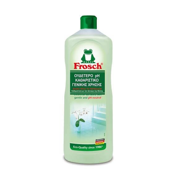Frosch’s ecological cleaning liquid with a neutral pH guarantees effective, ecological cleaning for use on floors, wood, kitchen and bathroom furniture, even on tiles and sanitary facilities. Thanks to its neutral pH and herbal composition based on plant ingredients, it is gentle on the skin, even with frequent use.