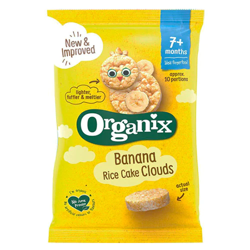 Organix organic rice wafer with organic apple and banana juice. Made from organic rice flour, rich in nutrients. Their texture is specially designed and soft for sensitive gums. The convenience provided by their shape encourages your baby to feed himself as he grows. Gluten & wheat free. Suitable for babies over 7 months.